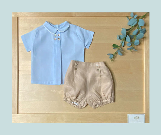 Boys-Sky Blue Shirt- Beige Bubble Shorts Set