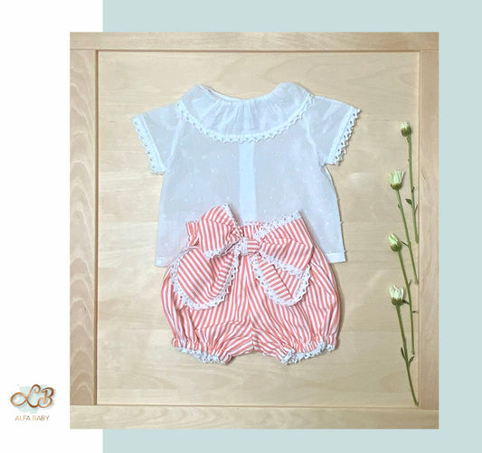 White Round Ruffled Collar Blouse and White-Coral Stripe Bubble Shorts-Toddler Girl Set
