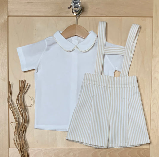 Boys-White Pique Top- Ivory-Vanilla Striped Suspenders Shorts Set-Boy's Clothing