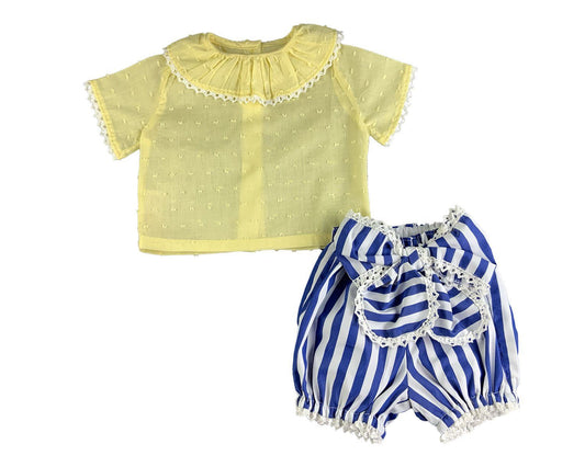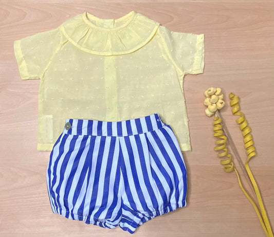 Girls-Yellow Round Ruffled Collar Blouse and Blue-White Stripe Bubble Shorts
