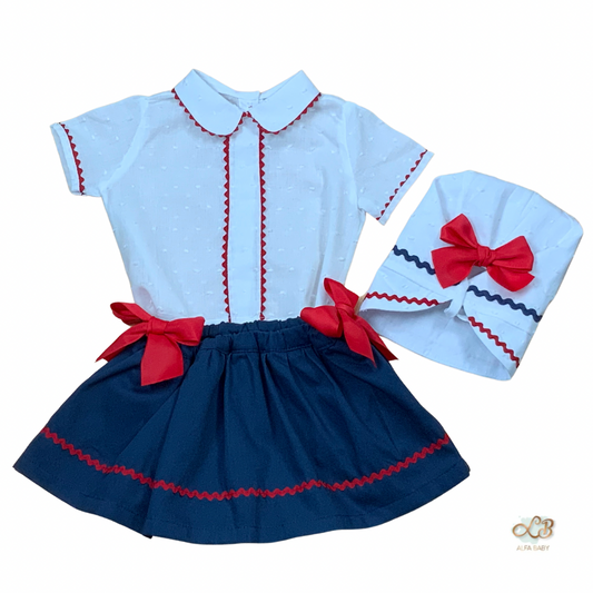 Red, white, and Blue Children’s Summer Outfit, Blouse, Bonnet, and Skirt Set