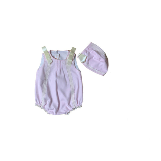 Girls-Pink Pique Bubble Romper-Bonnet Set-Girl Romper