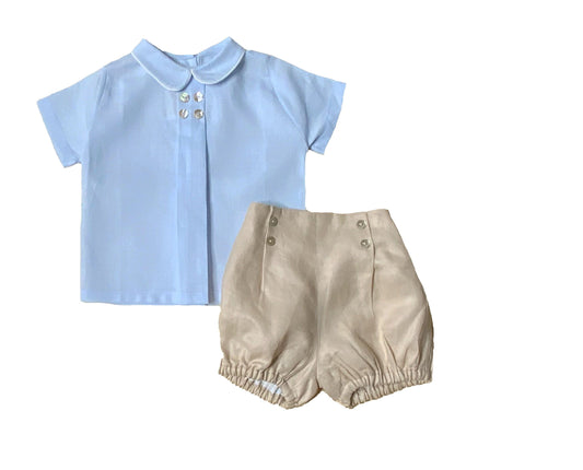 Boys-Sky Blue Shirt- Beige Bubble Shorts Set