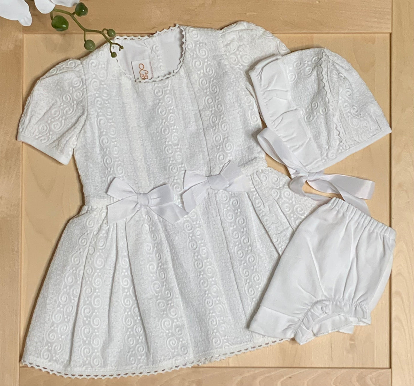 Girls- Embroidered White Cotton Puffed Sleeve Dress- Bonnet- Bloomers