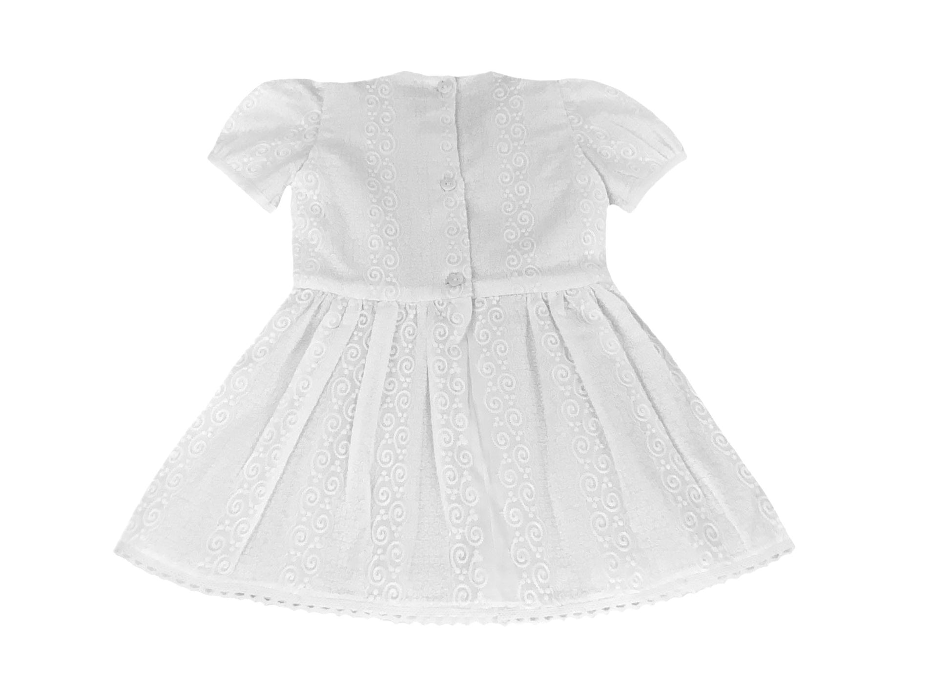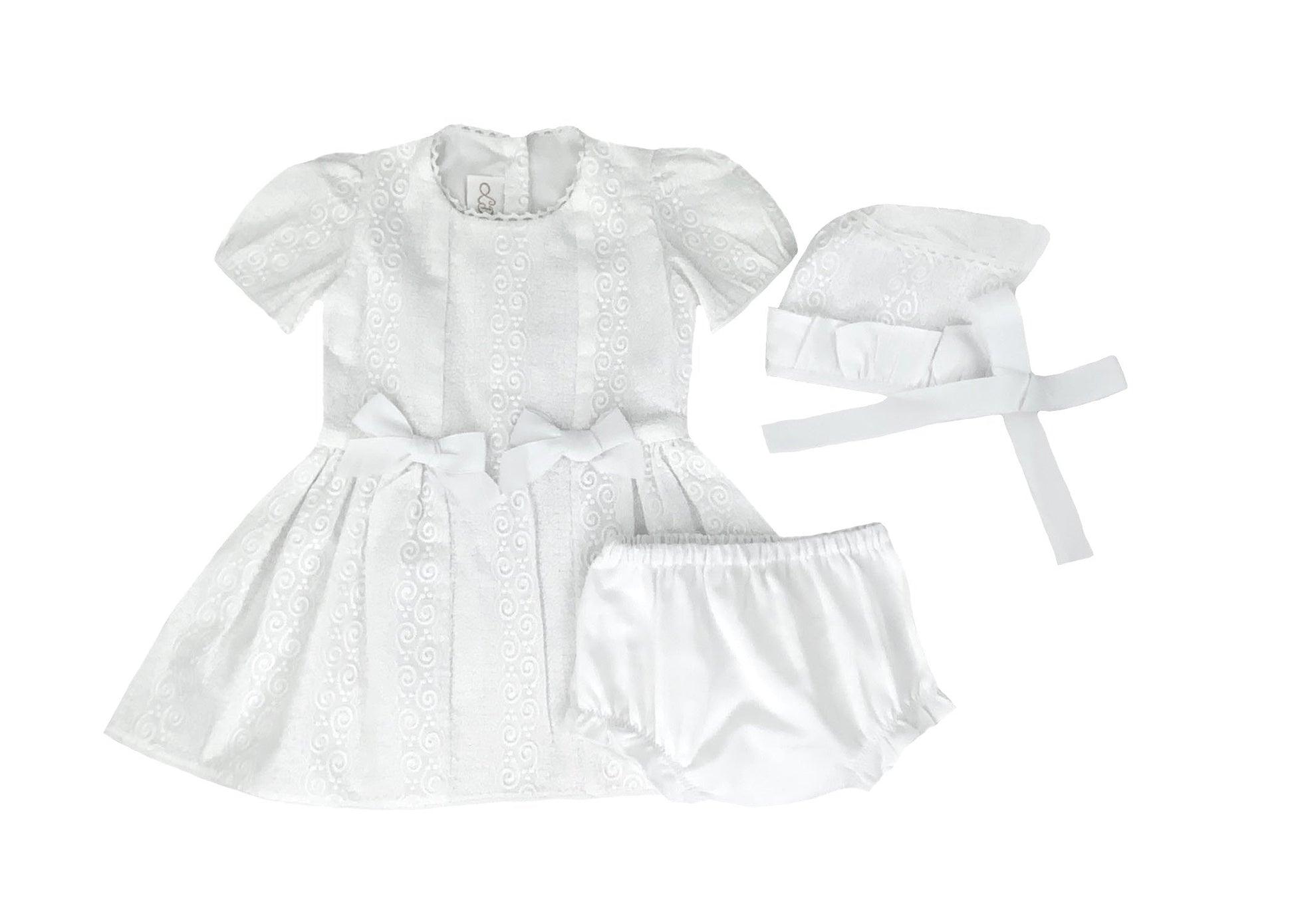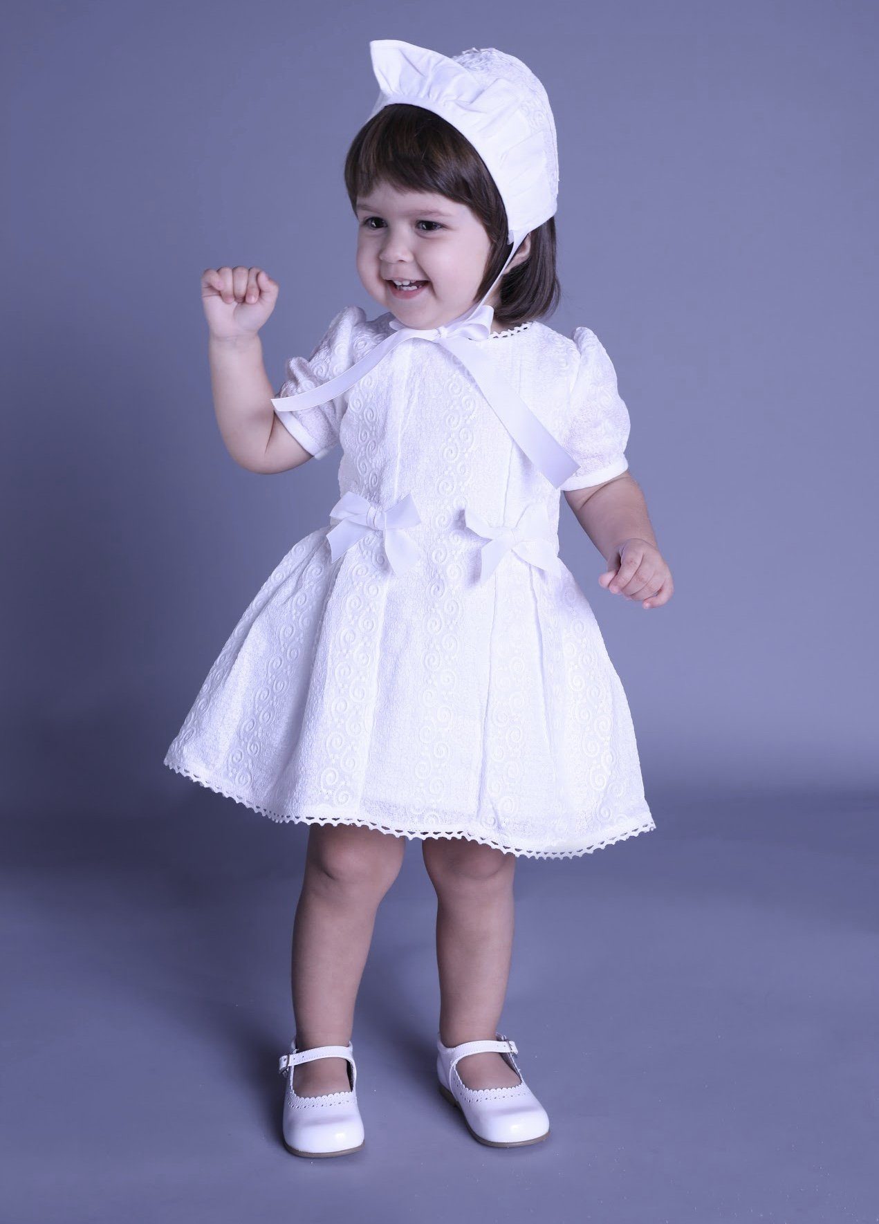 Your little lady will exude elegance in this white embroidered cotton dress. The puffed sleeves and nacar button closure add a touch of charm, while the waistline bows and crochet lace trimmings elevate its classic appeal. Complete the look with the included bonnet and bloomers.