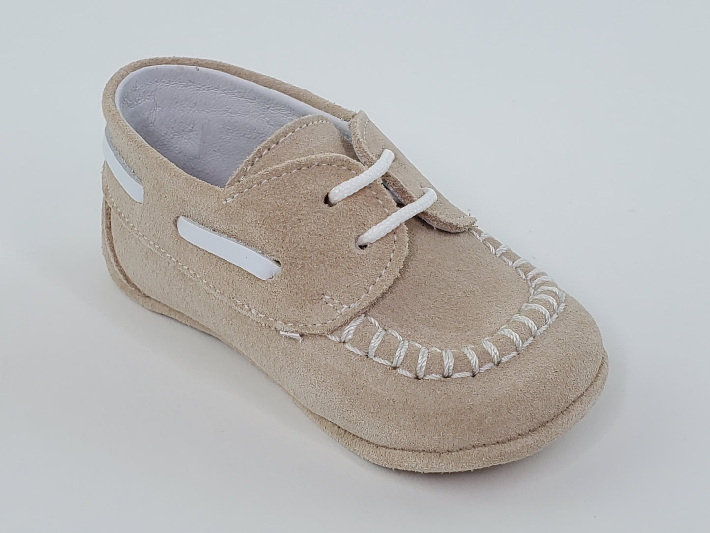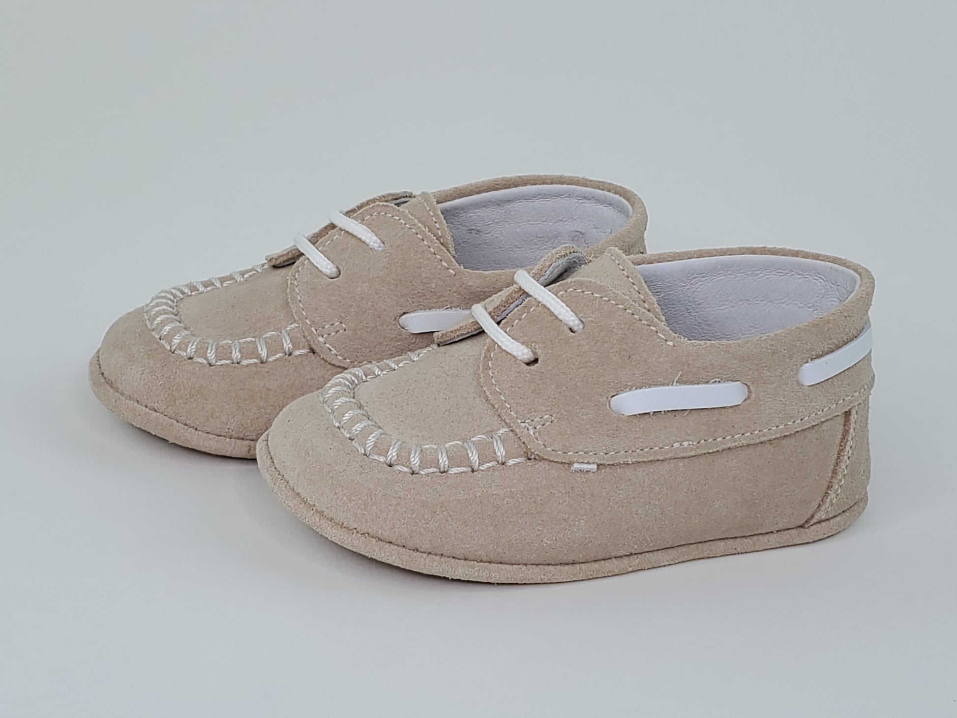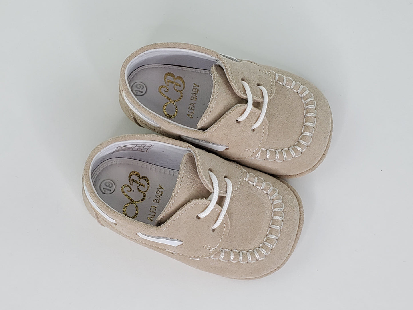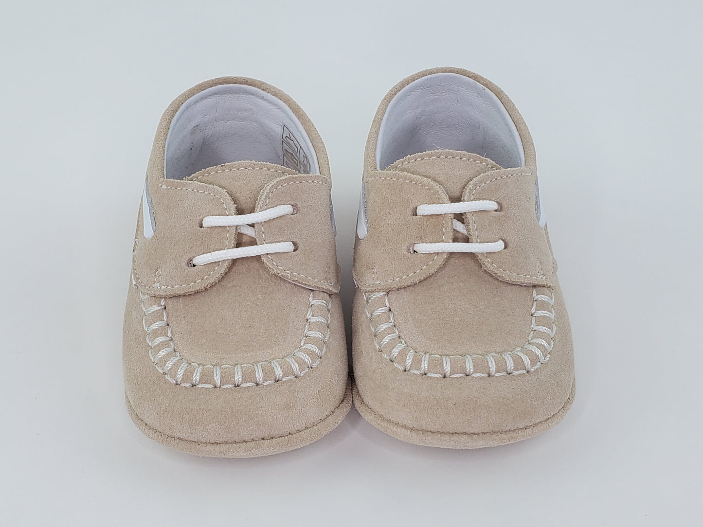 This round moc toe pre-walker Baby Boy Shoes is the perfect addition to achieve a casual but classic look. This Infant Shoes Upper is constructed in a latte macchiato color suede. Style with stitching and white leather decorative lacing. Breathable soft leather lining and a soft leather sole provide the perfect amount of flexibility and comfort for your baby’s growing feet.