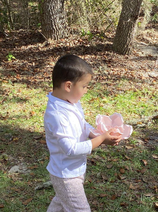 Boys Set, Long Sleeve White Cotton Shirt & Pink Tweed Wool Trousers Set